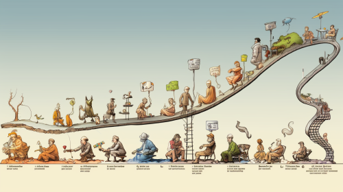 a comical rendering of a timeline of human history, humans are goofy and dumb --ar 16:9