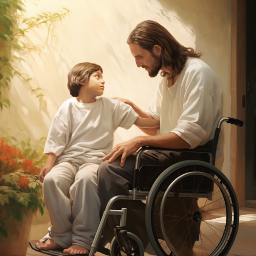 Jesus helping a little boy into a wheelchair outside a home. the little boys is wearing a plain shirt and levis
