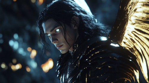 Golden-skull-headed angel, it has dark wings, gray short hair, black armor, he is in the underworld