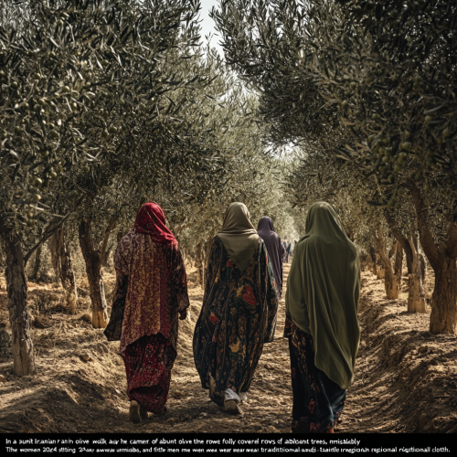 "In a sunlit Iranian olive grove, workers walk away from the camera through rows of abundant olive trees, their attire unmistakably Iranian. The women wear fully covered hijabs, fitting 2024 standards in Tehran, and the men wear traditional regional clothing. Textures and patterns on their clothing are culturally familiar, signaling Iranian heritage through small woven details and earthy colors. The unity and dedication of the workers is highlighted as they move through the trees, which are dense with green olives, under a soft morning light."\