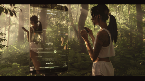 A landscape of harmonious integration between advanced technology and pristine nature, featuring a life-size, sleek "everything interface" mirror. Young male and female designers, dressed in minimalist fashion, are seen interacting with the mirror, reflecting both the natural environment around them and futuristic data displays. The scene is set in a serene, untouched forest at sunrise, with the soft glow of the morning light enhancing the futuristic elements. Created Using: digital art, photorealism, minimalism, nature-inspired, futuristic design, soft natural lighting, serene atmosphere, gender-inclusive representation, hd quality, natural look --ar 16:9 --v 6.0