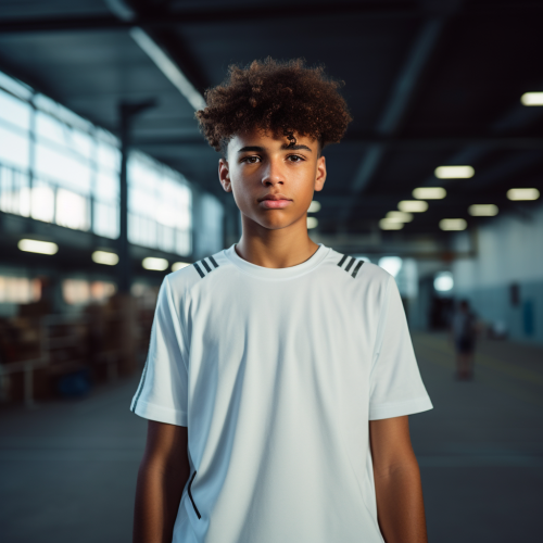 brasilian kid preparing to throw the basketball ball :: he is wearing white adidas clothes :: indoor, vibrant illumination, --ar 1:1 --style raw