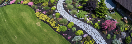 a garden landscape with flowering trees, joshua trees, and agave