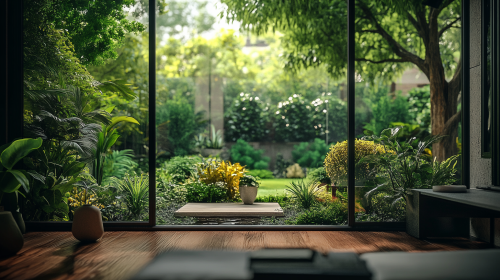 An ultra realistic photograph of a modern private room garden view from the room gallery. Day view. of The image was captured using a Canon EOS R5 with 50mm --ar 16:9