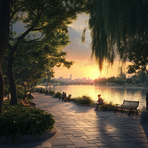 What Beijing looks like, fascinating, 2024s, imaginative, realistic, photographic of the city of Beijing, background Beijing city view, incredible, creative, river 3d render, trees, summer,people, country garden,people sitting on benches, sunset