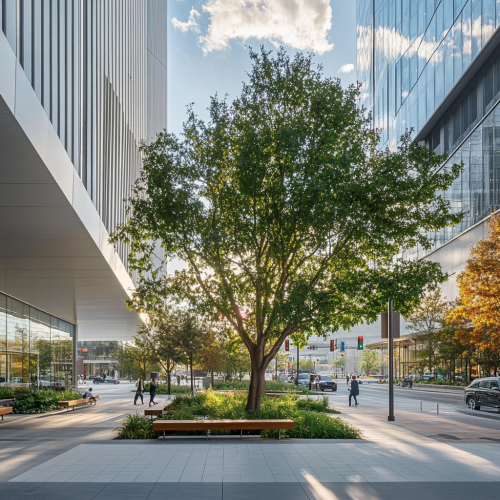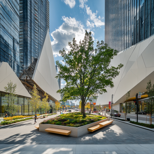 This image is set in a central garden in the center of a modern downtown building and includes the following elements: Central Garden: Around a large tree in the center of the image, landscaping, benches, and walking paths are naturally harmonized. On both sides are minimalist buildings with clean, angled white designs. With the warm sunlight shining on, the overall atmosphere is like a warm and modern urban garden. Street and Intersection: There is a crosswalk in front of the building, and a person is crossing the road. Traffic lights are also installed, and they are currently showing a green signal. Several cars are parked or driving on the road. Sky and Weather: Sunny weather is created, and blue skies and clouds decorate the background beautifully. This makes the overall atmosphere bright and peaceful. This image is set in a central garden between the two buildings and expresses relaxed daily life in a modern style central garden nestled among modern architecture in the city center. The image is realistic and is an aerial view.