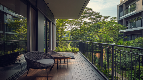 An ultra realistic photograph of a modern yet classy private room garden view from its balcony Day view. of The image was captured using a Canon EOS R5 with 50mm --ar 16:9