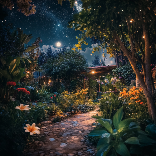 A tranquil midnight garden, bathed in soft moonlight, with flowers and plants creating a peaceful, serene environment under the starry sky. Taken with an iphone 15 pro
