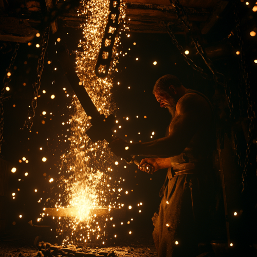 Low angle static shot: Inside a dark, rustic smithy, a towering blacksmith named Nikita forges a sword, surrounded by flying sparks. The only light comes from the blazing forge, highlighting his immense strength and determination. Chains hang in the background, adding to the intense, gritty atmosphere.