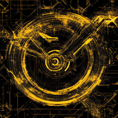 High-resolution image of a running bi-cycle symbol. The background is yellow and black. The design in a futuristic wireframe digital art with a dark cyberpunk aesthetic style use only yellow and black--aspect 826:483