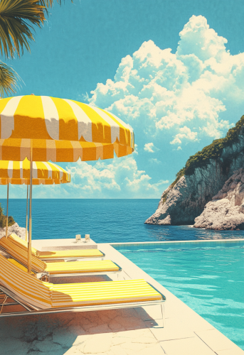 Realistic photo shot, 80's style, this image shows a picturesque scene of a poolside with sun loungers, two large yellow umbrellas, and a serene ocean view. yellow striped details --v 6.1 --ar 11:16
