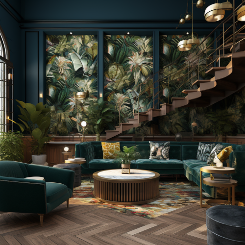 Create 4 Different design concepts for an botanical lounge highlighting the essential elements found in botanical design style
