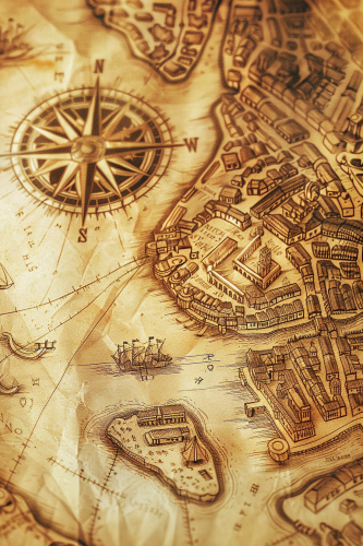 A stylized map of an ancient city, hand-drawn on aged parchment. The map includes winding rivers, narrow streets, and historic buildings, with an ornate compass in the corner. Sepia tones, soft light, subtle shadows. Created using: hand-drawing, Renaissance cartography style, aged paper texture, precise details, vintage iconography, historical accuracy, hd quality, natural look --ar 2:3 --v 6.0