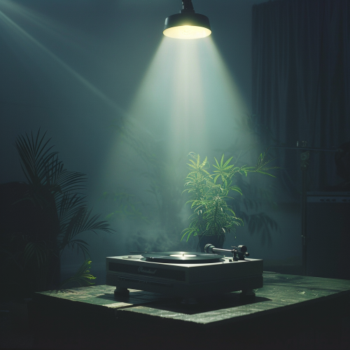 a cinematic film shot of a lone record player in a dark room with one, awesome large looking speaker, spotlight over the record player, slight haze in the background, weed plants as tiny palm trees for decoration, --v 6.0