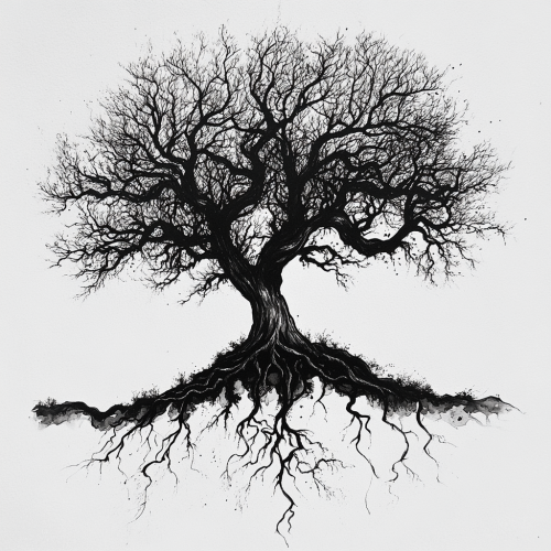 An ink wash illustration of a symbolic tree resembling the Tree of Life, with intricate, flowing branches extending outward and roots spreading below. The branches and roots are delicately connected, representing unity and growth, with a minimalist black and white aesthetic. The line work is fluid and organic, with slight variations in thickness to give a hand-drawn, soulful effect inspired by traditional East Asian ink painting. The overall look is serene and timeless, emphasizing the natural flow and interconnectedness of life.