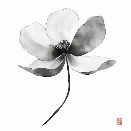 An ink wash illustration of a single flower, depicted in a minimalist style with soft, delicate brush strokes. The petals are simple and rounded, with a few light lines suggesting their shape and gentle curves. Black and white, with slight variations in line thickness to create an organic, hand-drawn feel inspired by traditional East Asian ink painting. The overall effect is elegant and serene, capturing the beauty and simplicity of the flower
