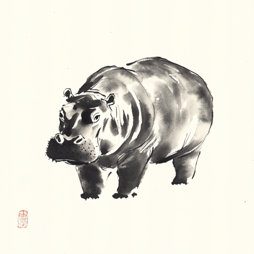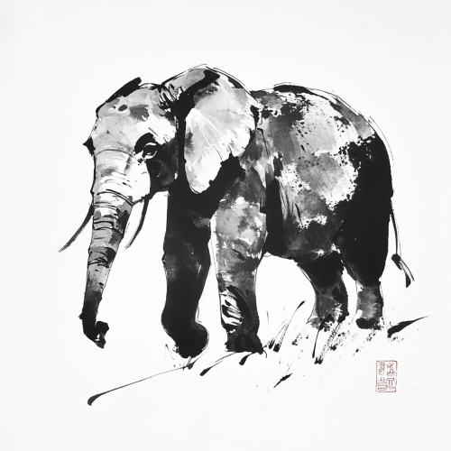 An ink wash illustration of an elephant, standing with a calm and majestic posture. The elephant's form is rendered in black and white with soft, fluid brush strokes, capturing the animal's strength and wisdom. The lines are slightly irregular, giving a hand-drawn, organic feel inspired by traditional East Asian ink painting. The overall effect is serene and symbolic, emphasizing the elephant's gentle yet powerful presence.