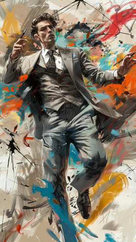 a lean man in a tailored gray linen sport jacket with pastel medium blue slacks wearing a bandolier filled with pens, black and red ink are flowing from his hands like a superpower, illustrated style, cinematic theme --ar 9:16 --v 6.0