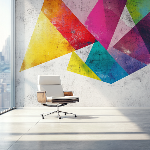 an advetisment photography with a fashion model with slim sunglasses wearing a soft plush pastel color tunic top with minimal pastel color embroidery, sitting on an office chair with poppy color walls and a window with rain in the background, warm to cool studio lighting --v 6.0