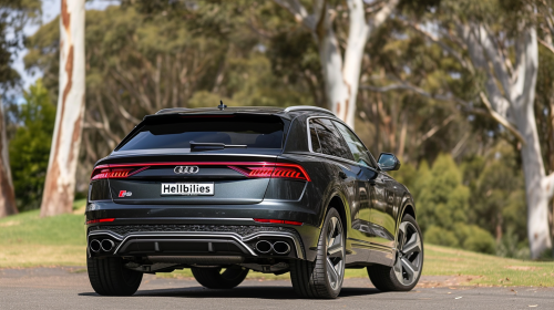 a text is written on the side of the Audi Q8:: the text "Hellbillies" in script font --s 40 --style raw --ar 16:9 --v 6.0