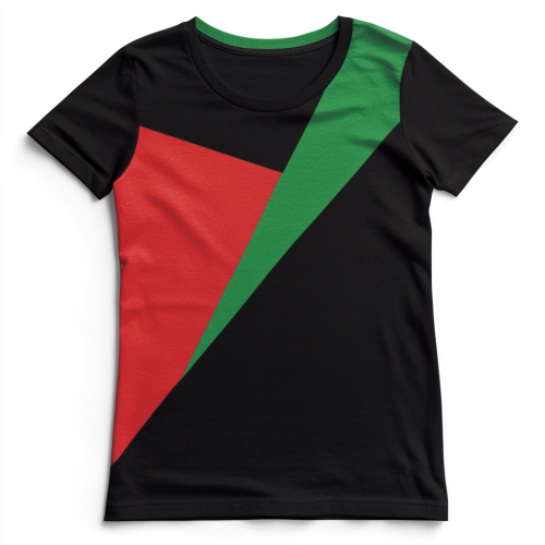 Design a women’s t-shirt entirely covered by the flag design provided. The t-shirt should feature a large red triangle on the left, with the top half in green and the bottom half in black, exactly following the flag's pattern. The design should wrap seamlessly around the entire t-shirt, including the front, back, and sleeves. The fit should be slightly tapered to flatter the female silhouette, while the colors--red, green, and black--must be bold and vibrant, creating a stylish and modern look that stands out.