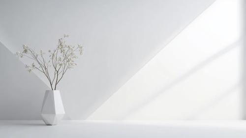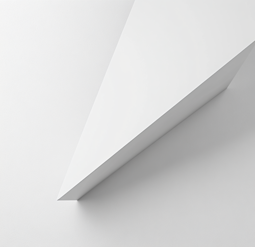 White background, empty space for text, minimalism, simple geometric shapes like triangles and squares, soft lighting with gentle shadows, cool color palette of whites and grays, minimalistic design elements, high resolution, high quality, high detail, sharp focus. --ar 16:9