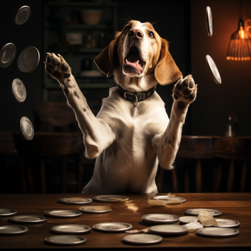 35mm shot of a casually dressed Elon musk playing fetch with a robotic dog with a body made of a smooth metallic yet translucent material that reflects the light with a subtle sheen and has glowing neon circuitry underneath it's skin limbs and paws, the head of the dog looks like a shiba inu with orange and white metallic fur, dog is wearing a dog collar with the letters "BYTE" on the dog collar, background is inside the xAI headquarters with magical and cybernetic digital elements --v 6.0