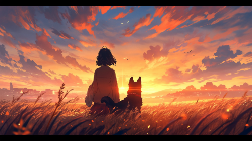 A girl watches the sunrise with her dog in the field. in studio ghibli syle, 8k --ar 16:9 --niji 5