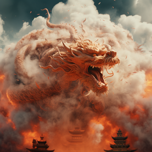 a dragon with red fire ball in the mouth, flying in the air, with background full of Chinese drawing cloud patterns, Chinese movie Jia zhangke directed, fujifilm camera style
