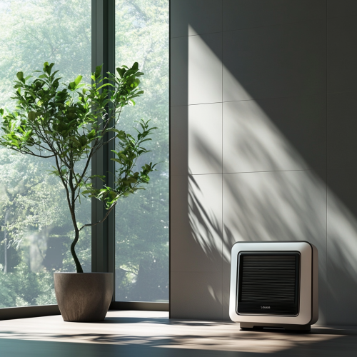 An energy-efficient space heater in a sleek design, positioned in a minimalistic room with large windows letting in natural light, showcasing its advanced technology and eco-friendly features, with a green plant nearby.
