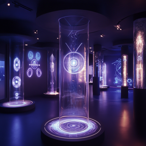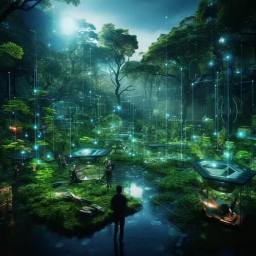 a Futuristic visualization of a lush, healthy forest with integrated AI technology hubs monitoring and protecting the ecosystem, radiating with bioluminescent data points, in a harmonious palette of natural greens and high-tech blues
