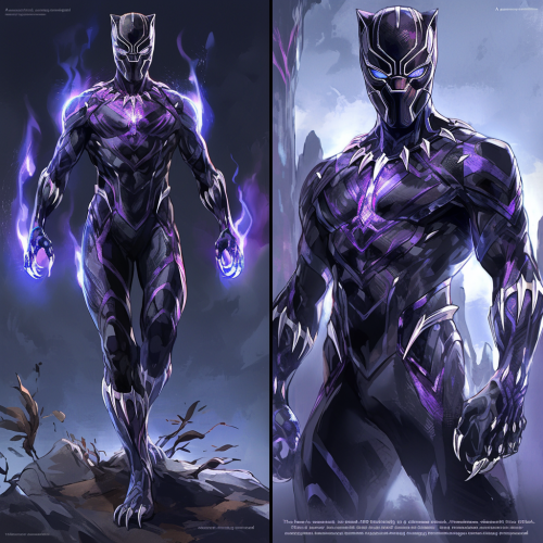 "A powerful, regal superhero inspired by Black Panther standing confidently in a cinematic 16:9 format. The hero is wearing his sleek, vibranium-infused black suit with sharp, cat-like details and glowing purple accents, symbolizing kinetic energy stored in the suit. His mask features the iconic panther ears, and the suit is detailed with intricate Wakandan tribal patterns. The background showcases a futuristic Wakandan city, with tall, glowing buildings and advanced technology, all subtly illuminated under a vibrant night sky. Black Panther stands on a rocky surface, his posture radiating leadership, grace, and the power of a king. A faint purple energy aura surrounds him, representing the vibranium's stored power and his connection to the advanced technology of Wakanda." --s 750 --style raw --niji 6