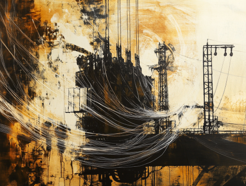 An abstract interpretation of a massive transformer in the heart of an urban landscape, with energy ripples expanding in all directions like delicate threads. The simplicity of the scene captures the idea of silent power, with emphasis on light and shadow contrast --ar 4:3 --v 6.1