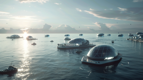Futuristic maritime scene near Japanese waters on October 5, 2111, showcasing advanced sea-based technology. The foreground shows futuristic vessels equipped with sustainable energy sources navigating the calm ocean, while a floating habitat integrates advanced aquaculture and renewable energy systems. In the background, a serene horizon under a clear sky suggests a harmonious balance between human innovation and the marine environment. The lighting is bright and futuristic, embodying a vision of the ocean’s role in future sustainability. --ar 16:9 --v 6.0 --style raw