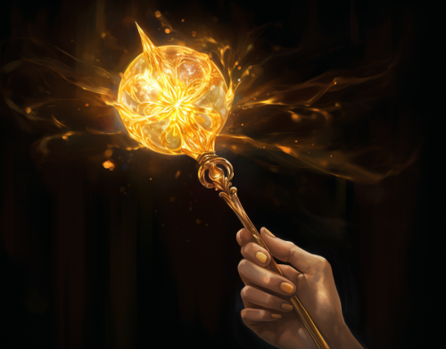 a hand holding a small magical scepter radiating golden energy, fantasy illustration --ar 9:7