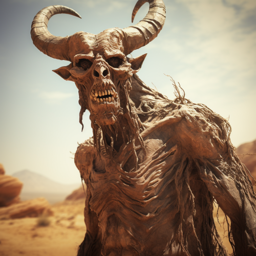 A vast city stretches across a desolate desert landscape, built upon the remains of an ancient cemetery. Massive, weathered tombs resembling early pyramids and mastabas are scattered across the terrain, some transformed into homes or workshops. Mummified remains are preserved in niches within the houses, an everyday sight for the inhabitants. Towering rock-cut tombs dot the surrounding cliffs, their grandeur diminished by the dry, oppressive air. Throughout the city, old sarcophagi serve as tables or storage. The city’s architecture blends ancient stone with makeshift additions, creating a labyrinthine sprawl of alleys and courtyards. The dimness contrasts with the occasional flicker of firelight or shadows moving silently. --v 6.0