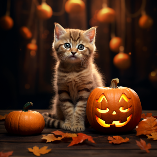 cute cat holding pumpkin with gifs scattered behind, in the style of solarization effect, striped, contest winner, uhd image, smilecore, felt creations, wimmelbilder