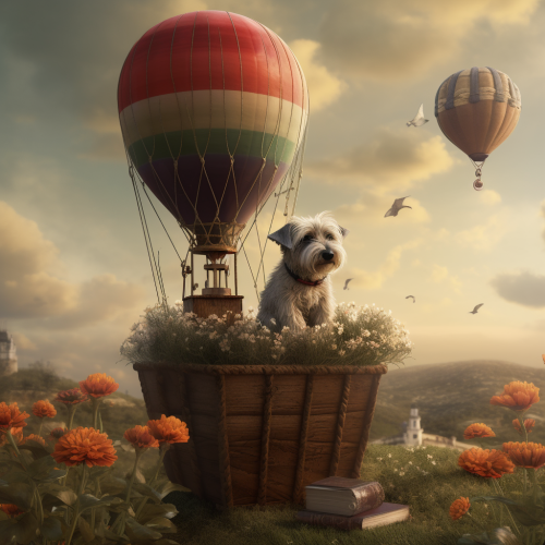 a dog is sitting in a basket with flowers and air balloon, a storybook illustration by Tracey Moberly, pixabay contest winner, romanticism, whimsical, daz3d, artwork --s 250 --v 5.0