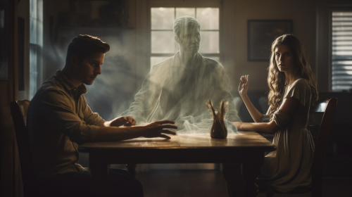 Two woman and one man sitting around a dining room table with a ghost out of focus in the background --ar 16:9