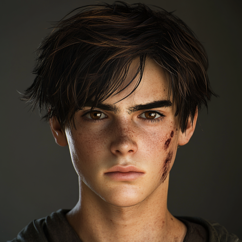 hyper realistic photo of Sam is an 18-year-old young man with dark brown hair that's slightly messy, falling casually over his forehead. He has intense brown eyes that reveal both determination and a hint of worry. His physique is athletic and lean from frequent running, making him quick and resilient--a crucial skill for surviving in a world overrun by zombies. His face shows a few faint scars, signs of past close encounters. Sam is fiercely protective of his little sister, Alyssa, and his best friend, Mia, and his strong sense of duty often leads him to take risky chances. Though courageous and determined, there’s a vulnerability in him, a mixture of fear and guilt that he tries to mask with bravery.