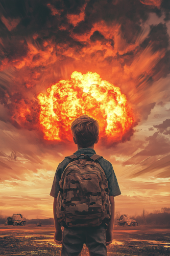 realistic colorful Illustration, photorealistic teenage boy 13 years old with a tourist backpack in post-acalyptic picture of a nuclear explosion, --ar 2:3