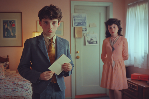 1994, Wes Anderson style, nerdy teenage boy wearing school blazer shirt and tie, sitting in back of car, frontal, color film --ar 3:2 --style raw --s 250