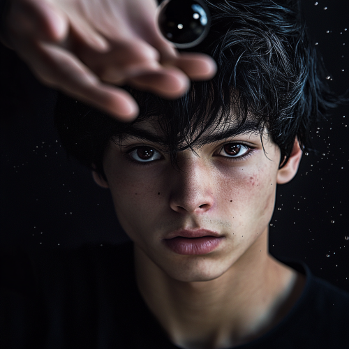 a teenager with powers, age 17, with black hair. He is looking into the camera with a piercing facial expression. Floating above his hand is a miniature black hole that distorts space around it. He controls this black hole.