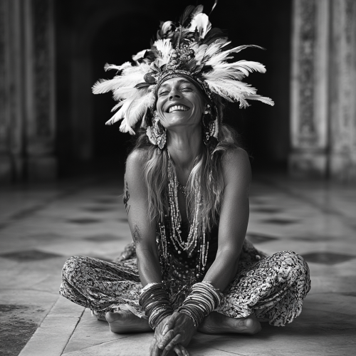 Like for example A holy woman with long dreadlocks wearing white garments sits in lotus pose. Padmanasana. in an Indian temple under a tree facing the Narmada river as the sun sets performing Agnihotra fire