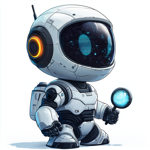 Cartoon-style futuristic robot detective logo in vector graphics, with bold outlines, flat colors, and simplified shapes. Design the character to be playful and friendly, using exaggerated proportions typical of cartoons. Include subtle elements like a glowing magnifying glass or digital data streams, reflecting advanced intuition. Use a cool color palette of blues, greens, and metallics to maintain a tech-savvy look. Design it with a plain white background, suitable for a microsite web API product and simple enough for stickers and branding. --v 6.1 --stylize 1000 --q 2 --ar 1:1