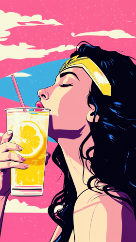 A woman drinks lemonade with bold outlines on pink