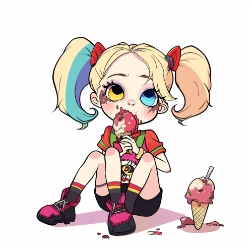 cartoon, child book, simple colors, white background, Harley Quinn eating ice cream in a messy way --s 20 --v 6.0 --style raw