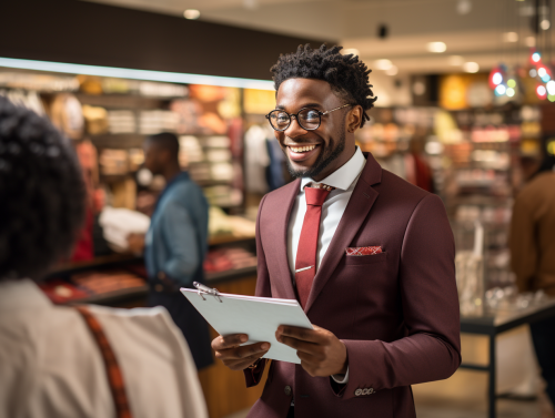 a retail employee taking feedback notes from customers --ar 4:3 --s 250