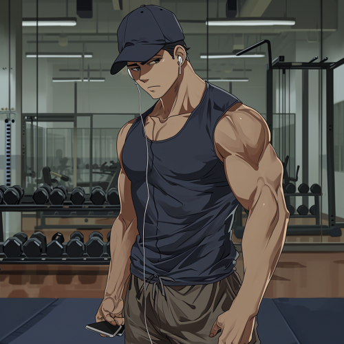 a man with cap, headphone, dark colored midriff-baring T-shirt , shorts with inner shorts, muscular thighs and triceps, is listening iphone, proud,shaved sides look, thick eyebrows, miracle eye power, inside gym, japanese banana fish anime style --ar 1:1 --v 6.0