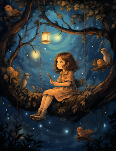Children's illustration inspired by Maurice Sendak of a girl sitting in a tree at night --ar 17:22